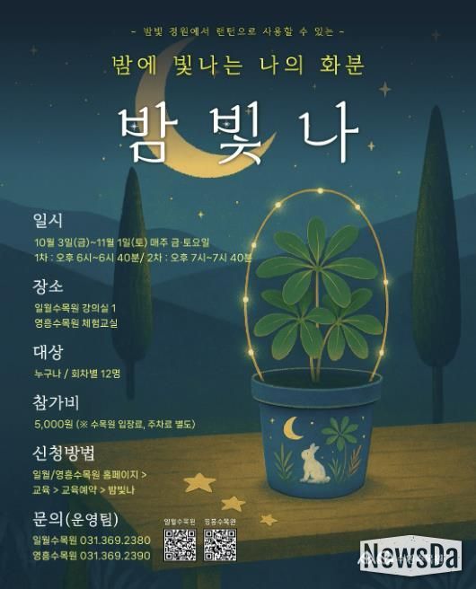 뉴스다 최광묵 기자 | 수원특례시는 일월·영흥 수목원에서 10월 3일부터 11월 1일까지 매주 금·토요일 야간에 열리는 행사 ‘밤빛정원’에서 다양한 체험 프로그램들을 운영한다.