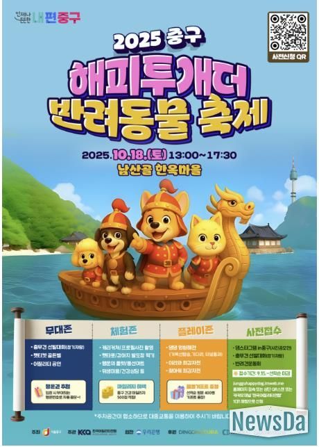 뉴스다 최광묵 기자 | 서울 중구는 오는 10월 18일 오후 1시부터 5시 30분까지, 남산골 한옥마을에서‘2025 해피투개(dog)더’ 반려견 축제를 연다. 올해로 3회째를 맞이한 이번 축제는 ‘충무공 이순신 탄생지, 중구’의 의미를 더해 용맹과 지혜, 교감을 담은 다채로운 프로그램으로 꾸렸다.