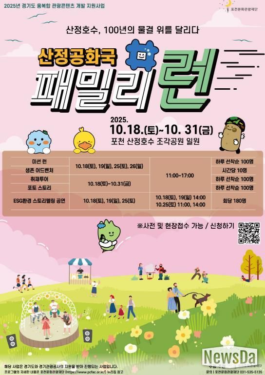 뉴스다 최광묵 기자 | 포천문화관광재단은 오는 10월 18일부터 31일까지 산정호수 일원에서 전 연령층이 함께 즐길 수 있는 체험형 관광콘텐츠 '산정공화국 패밀리런'을 개최한다.
