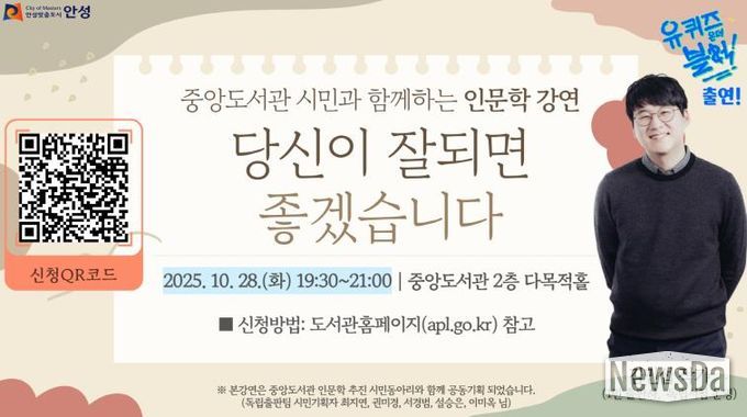 뉴스다 최광묵 기자 | 안성시는 오는 10월 28일 저녁 7시 30분, 중앙도서관 다목적홀에서 정미소출판사 대표이자 『당신이 잘되면 좋겠습니다』의 저자 김민섭 작가를 초청해 시민 강연회를 개최한다.