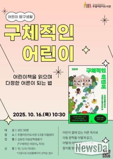 뉴스다 최광묵 기자 | 고양특례시 주엽어린이도서관은 오는 10월 16일과 11월 5일 성인을 대상으로 인문학 강연‘어린이 탐구생활’을 진행한다고 밝혔다.