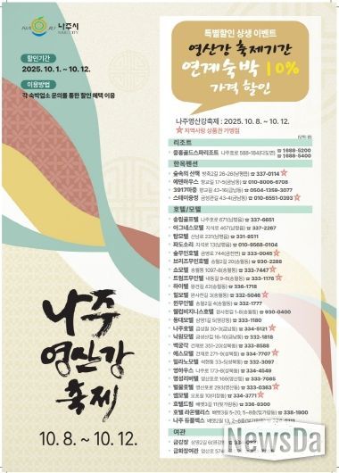 뉴스다 최광묵 기자 | 전라남도 나주시가 오는 10월 8일부터 12일까지 열리는 ‘2025 나주영산강축제’ 기간 동안 지역 숙박업소와 함께하는 숙박 특별할인 상생 이벤트를 마련했다.