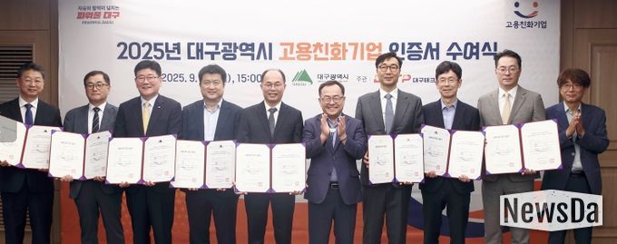 뉴스다 최광묵 기자 | 대구광역시는 9월 29일 오후 3시, 시청 산격청사에서 ‘2025년 고용친화기업 인증서 수여식’을 열고, 고용 창출 및 근무환경이 우수한 고용친화기업 신규 5개사와 재인증 6개사를 선정해 인증서를 수여했다.
