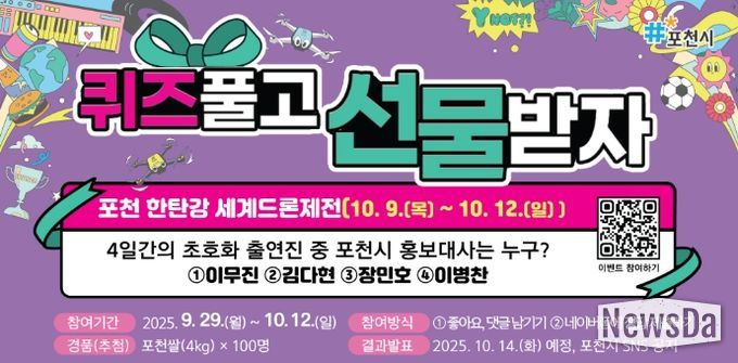 뉴스다 최광묵 기자 | 포천시는 시민과의 소통 강화를 위해 10월 12일까지 '포천 한탄강 세계드론제전' 퀴즈 이벤트를 진행한다.
