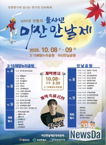 뉴스다 최광묵 기자 | 창원특례시는 오는 10월 8일과 9일, 마산합포구 소재 만날근린공원과 3.15해양누리공원에서 ‘을사년 마산만날제’를 개최한다고 밝혔다. 올해 마산만날제는 전통민속축제의 특색을 살리면서도 시민과 관광객 모두가 더욱 풍성하게 즐길 수 있도록 장소를 이원화해 진행된다.