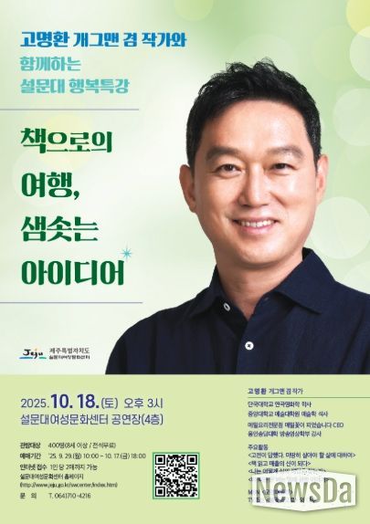 뉴스다 최광묵 기자 | 제주특별자치도 설문대여성문화센터는 오는 10월 18일(토) 오후 3시, 4층 공연장에서 개그맨 겸 작가 고명환을 초청하여‘책으로의 여행, 샘솟는 아이디어’라는 주제로 행복특강을 개최한다.