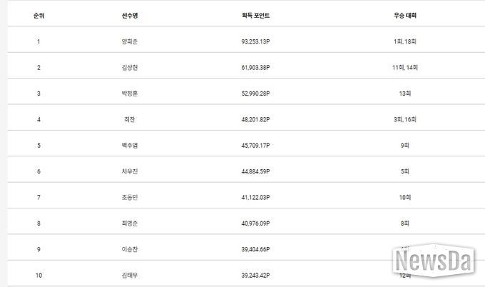 2위 김상현과 10위 김태우(27.(주)하이니스임플란트)의 포인트 격차는 22,659.96포인트다. 또한 10위 김태우와 13위 이승형(22), 17위 김범수(27)와 포인트 차는 각각 10,221.45포인트, 12,766.24포인트다. 10위 김태우와 20위 하충훈(35.㈜일신테크놀로지)와 차이는 16,500.06포인트다.
