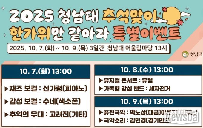 10월 7일부터 9일까지 3일간 13시에 청남대 어울림마당에서 열리는 이벤트에서는 첫날 피아노와 색소폰, 기타 연주가 어우러진 다양한 보컬 공연을 선보인다.
