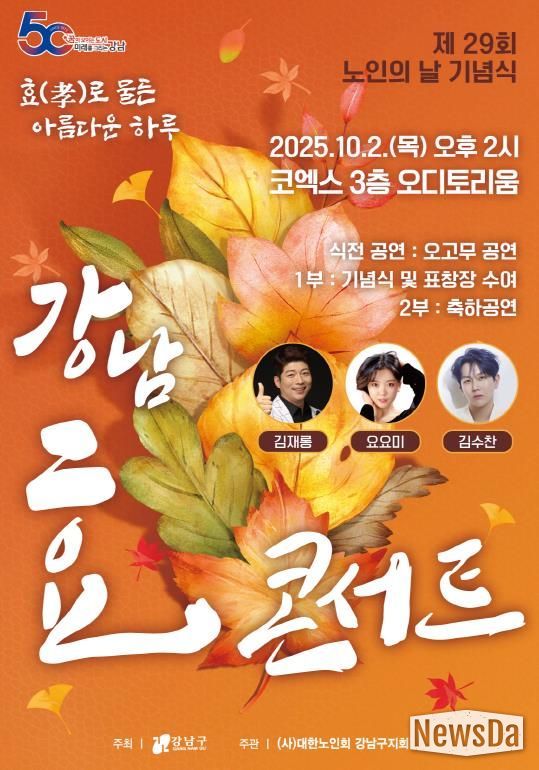 뉴스다 최광묵 기자 | 꿈이 모이는 도시, 미래를 그리는 강남구가 제29회 노인의 날을 맞아 오는 10월 2일 오후 2시, 코엑스 3층 오디토리움에서 어르신 1,000여 명을 초대해 ‘효(孝)로 물든 아름다운 하루’를 주제로 기념행사를 연다.