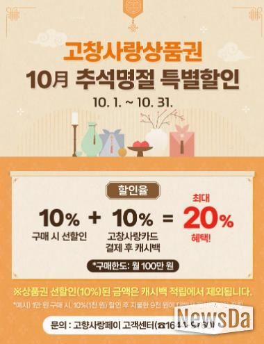 뉴스다 최광묵 기자 | 고창군이 추석을 맞아 군민 생활안정과 지역경제 활성화를 위해 ‘고창사랑상품권 특별할인 행사’를 진행한다. 이번 행사는 10월 한 달간 진행된다.