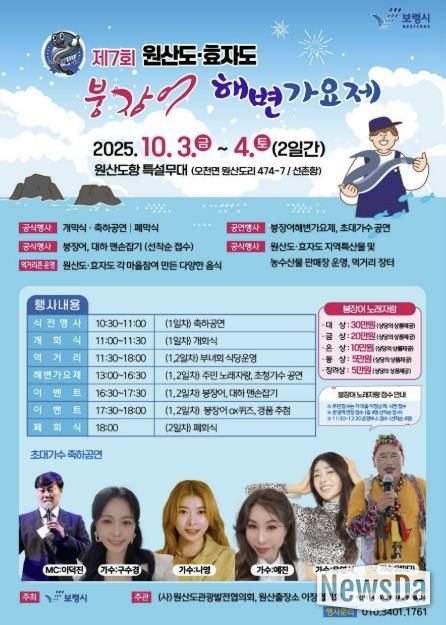 뉴스다 최광묵 기자 | 보령시가 주최하고 (사)원산도관광발전협의회가 주관하는 ‘제7회 원산도·효자도 붕장어 해변가요제’가 오는 10월 3일부터 4일까지 2일간 원산도항 특설무대에서 개최된다.