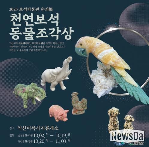 뉴스다 최광묵 기자 | 익산시 보석박물관은 추석 연휴가 시작되는 10월 2일부터 11월 3일까지 익산미륵사지휴게소(양방향)에서 '천연보석 동물조각상' 순회전시를 진행한다.