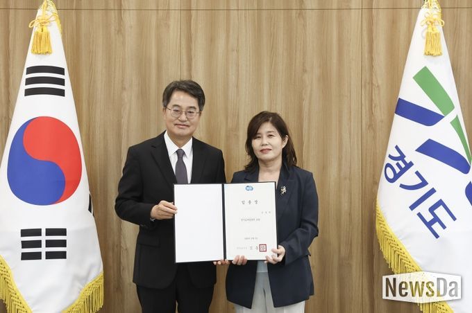 김동연 경기도지사는 30일 오전 경기도청에서 윤명희 신임 경기도서관장에 임명장을 수여했다.