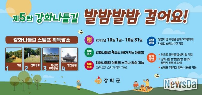 뉴스다 최광묵 기자 | 강화군은 10월 한 달간 강화나들길 활성화를 위해 ‘제5탄 강화나들길 발밤발밤 걸어요!’ 챌린지를 진행한다고 밝혔다.