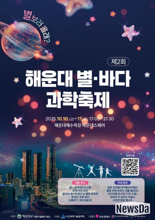 뉴스다 최광묵 기자 | 해운대구는 부산과학기술협의회와 함께 10월 10일과 11일 오후 5시부터 9시 30분까지 해운대해수욕장 해운대스퀘어에서 ‘제2회 해운대 별, 바다 과학축제’를 연다.