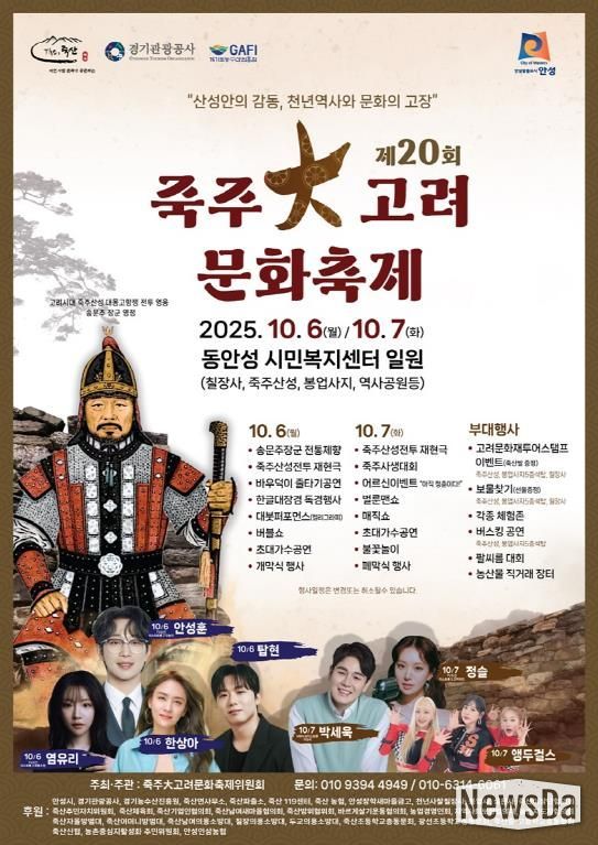 죽주대고려문화축제위원회는 오는 10월 6일부터 7일까지 이틀간 동안성시민복지센터 일원에서 제20회 죽주대고려문화축제를 연다고 밝혔다. 올해 축제는 ‘산성안의 감동, 천년역사와 문화의 고장’을 주제로, 송문주 장군과 죽주산성 전투의 역사적 의미를 기리고 지역 문화예술을 널리 알리기 위해 마련됐다.