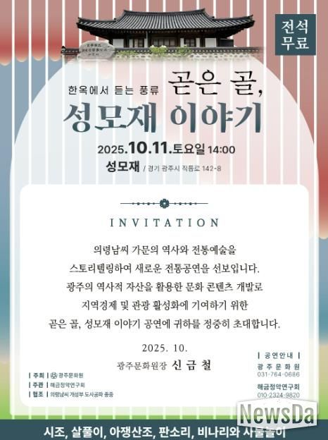 뉴스다 최광묵 기자 | 광주문화원은 성모재(직동로142-8)에서 2025년 10월 11일 14:00 시민들을 대상으로 “제10회 광주시 문화의 날 행사” 를 개최한다고 밝혔다.