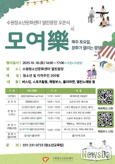 뉴스다 최광묵 기자 | 수원시청소년청년재단 청소년문화센터는 오는 10월 18일 청소년문화센터 야외광장에서'열린광장 오픈식‘모여락(樂')을 개최한다.
