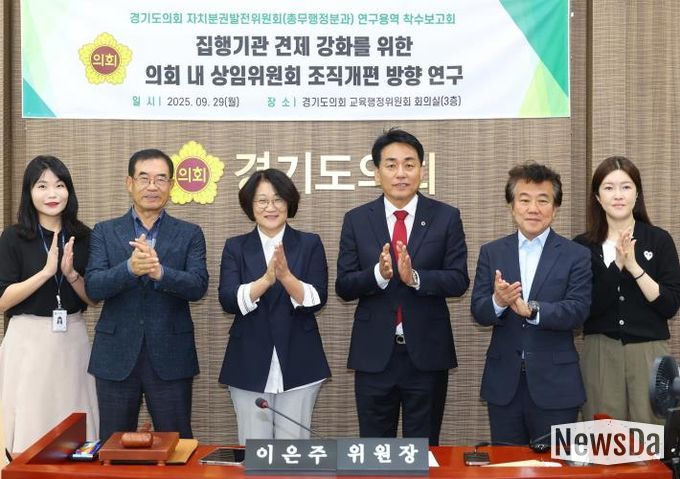 뉴스다 최광묵 기자 | 경기도의회 자치분권발전위원회 총무행정분과는 9월 29일 도의회 교육행정위원회 회의실에서 '집행기관 견제 강화를 위한 의회 내 상임위원회 조직개편 방향 연구' 착수보고회를 개최했다. 이번 연구는 향후 의원 정수 확대에 따라 예상되는 의정 환경 변화에 대응하고, 특히 교육분야 상임위 증설의 필요성을 검토하기 위해 추진됐다.