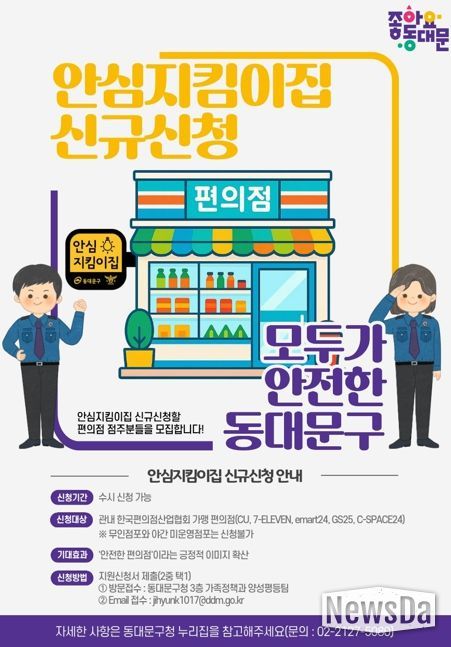 뉴스다 최광묵 기자 | 서울 동대문구는 여성·아동 등 범죄취약계층을 보호하기 위해 안심지킴이집 신규 지정 확대 사업을 추진한다고 밝혔다.