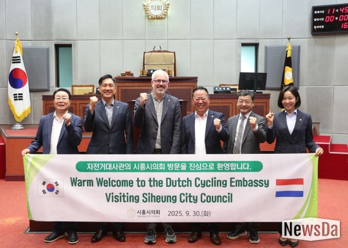 뉴스다 최광묵 기자 | 시흥시의회 도시환경위원회가 9월 30일 의회청사 소담뜰에서 네덜란드 자전거대사관(Dutch Cycling Embassy, DCE)을 초청해 간담회를 열고, 시흥시 자전거 정책 발전 방향과 친환경 교통 시스템 구축 방안에 대해 논의했다.