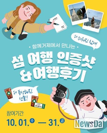 뉴스다 최광묵 기자 | 거제시 시정소식지‘함께거제’는 시민과 독자의 참여를 확대하고, 거제 섬 여행의 매력을 널리 알리기 위해‘섬 여행 인증샷 & 여행후기 이벤트’를 10월 한 달간 진행한다.