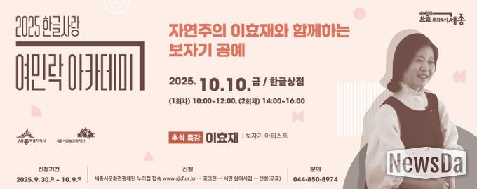 뉴스다 최광묵 기자 | 세종시문화관광재단(대표이사 박영국)은 ‘2025 한글사랑 여민락 아카데미 추석 특별강좌’를 오는 10월 10일 진행한다.