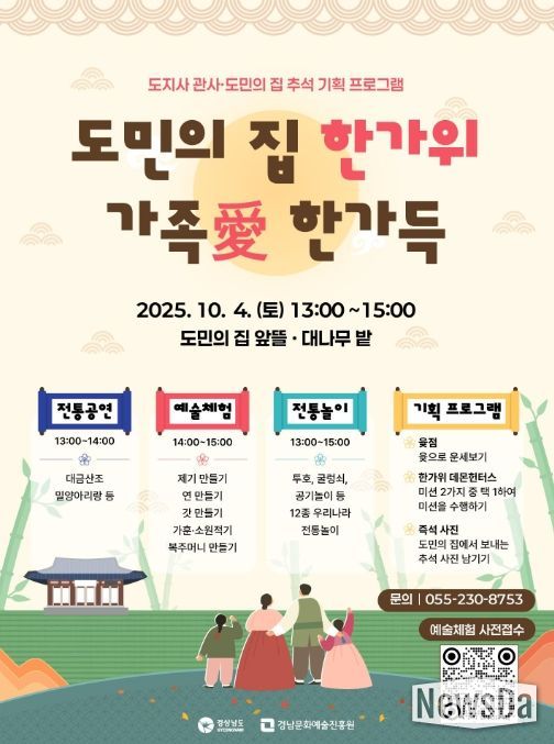 뉴스다 최광묵 기자 | 경상남도는 10월 4일 오후 1시부터 3시까지 도심 속 복합문화공간 활성화를 위해 추석을 맞아 귀향객과 도민이 함께 즐길 수 있는 기획 프로그램 ‘도민의 집 한가위, 가족愛 한가득’을 개최한다고 밝혔다.