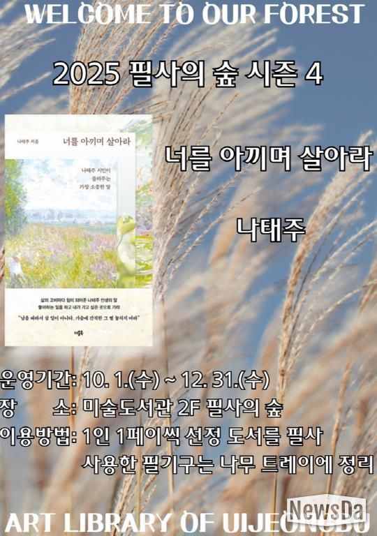 뉴스다 최광묵 기자 | 의정부미술도서관은 올해 1월부터 운영해 온 시민 참여 독서 프로그램 ‘필사의 숲’ 10월 프로그램을 운영한다.