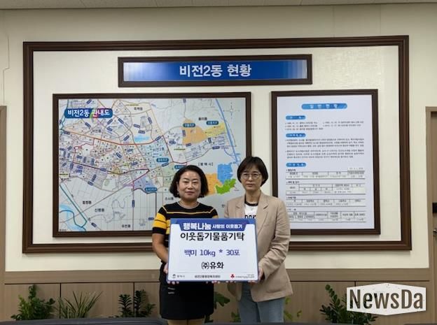 뉴스다 최광묵 기자 | ㈜유화는 추석 명절을 맞아 지난 29일 비전2동 행정복지센터를 방문하여 100만원 상당의 백미 30포를 전달하며 온정을 베풀었다.