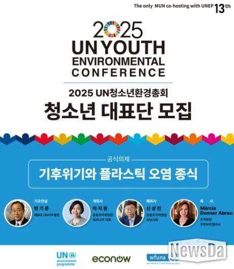뉴스다 최광묵 기자 | 성남시청소년청년재단 판교유스센터와 환경단체 에코나우는 오는 11월 15일부터 16일까지 이틀간 성남 국립국제교육원에서 열리는 ‘2025 UN청소년환경총회’에 참가할 국내외 청소년 대표단 300명을 10월 13일까지 모집한다. 이번 총회는 성남시청소년청년재단 판교유스센터와 환경단체 에코나우가 공동 주관하며, 반기문 전 UN사무총장과 브라질 대사 등 주요 인사가 참석한다.