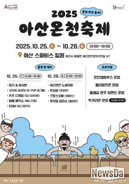 뉴스다 최광묵 기자 | 아산시가 주최하는 ‘2025 아산온천축제’가 오는 10월 25일부터, 26일까지 이틀간 아산스파비스 일원에서 열린다.