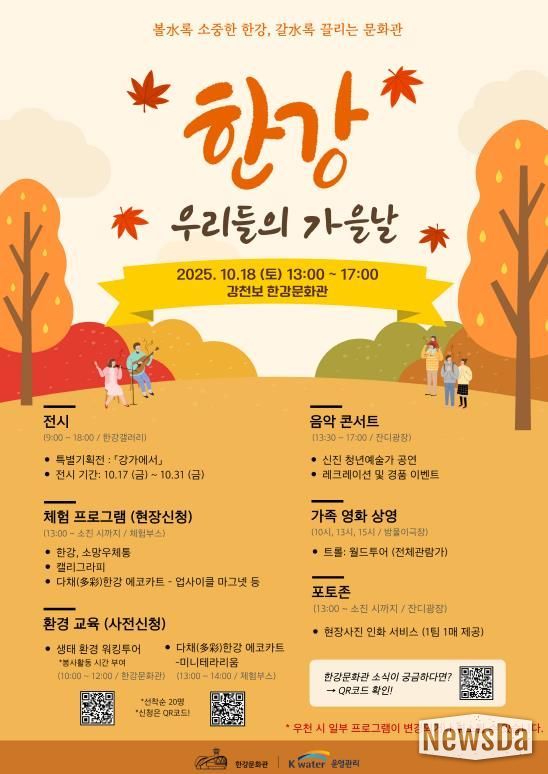 뉴스다 최광묵 기자 | K-water한강보관리단과 케이워터운영관리 한강문화관은 오는 10월 18일 가족과 이웃이 함께 즐기는 대표 문화축제 “한강, 우리들의 가을날”를 개최한다고 밝혔다