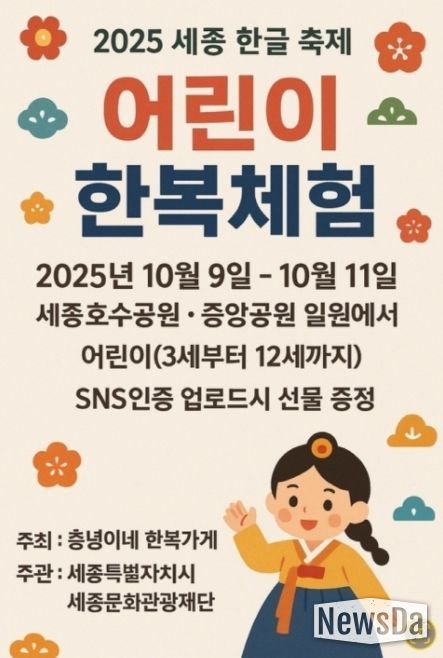 뉴스다 최광묵 기자 | 오는 10월 9일부터 11일까지 세종호수공원 일원과 시 전역에서 ‘2025 세종한글축제’가 열린다.