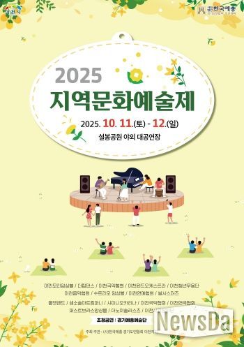 뉴스다 최광묵 기자 | (사)한국예총 이천지회가 주최·주관하는 지역 예술인들의 축제인 ‘2025년 지역문화예술제’가 오는 10월 11일부터 12일까지 이틀간 오후 2시부터 오후 6시 30분까지 설봉공원 야외대공연장에서 개최된다.