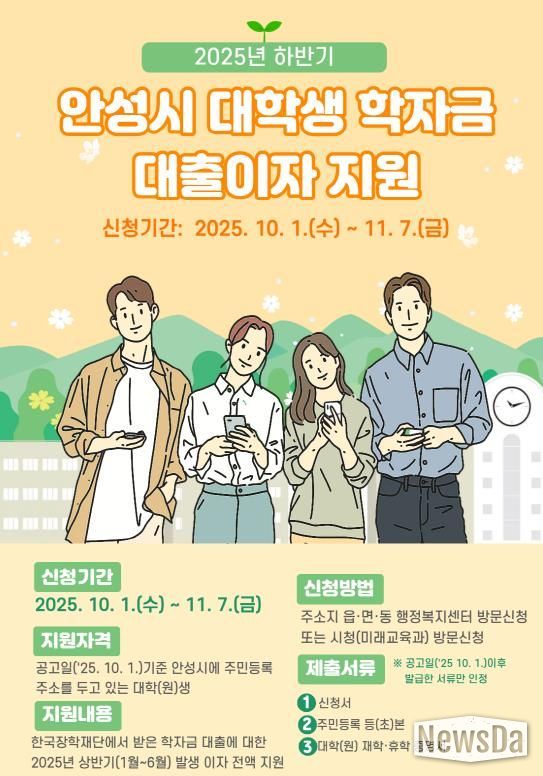 뉴스다 최광묵 기자 | 안성시는 오는 10월 1일부터 11월 7일까지 ‘2025년도 하반기 안성시 대학생 학자금 대출이자’ 지원 신청을 받는다.