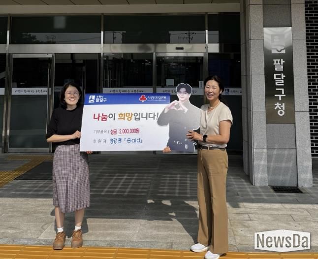 뉴스다 최광묵 기자 | 배우 송강 팬모임 ‘송aid’가 지난 1일 수원시 팔달구 출신 배우 송강의 군복무 전역을 기념하여 팔달구 내 저소득층 아동·청소년 가구에 장학금 명목의 성금 200만원을 기부했다.