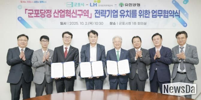 뉴스다 최광묵 기자 | 군포시는 2일 군포시청에서 한국토지주택공사(LH), ㈜유한양행과 ‘군포당정 산업혁신구역’ R·D 전략기업 유치를 위한 업무협약을 체결했다고 밝혔다.