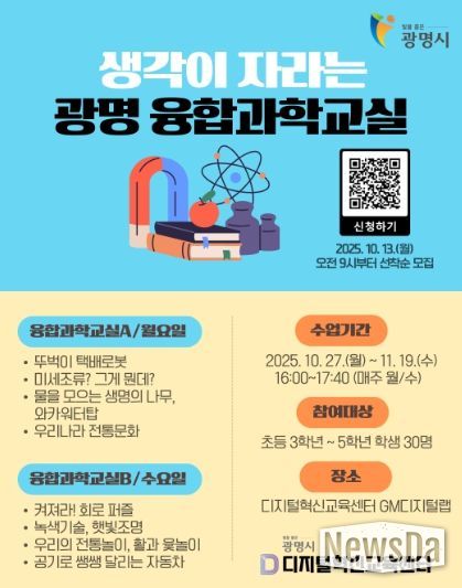 뉴스다 최광묵 기자 | 광명시는 오는 10월 27일부터 11월 19일까지 초등학교 3~5학년을 대상으로 ‘생각이 자라는 광명 융합과학교실’ 시범수업을 운영한다.