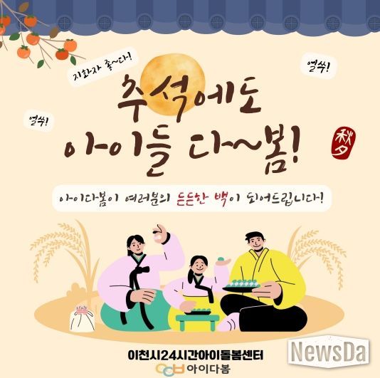 뉴스다 최광묵 기자 | 이천시는 추석 연휴 기간에도 이천시 24시간 아이돌봄센터인 ‘아이다봄’을 365일 24시간 정상 운영해 연휴 중 발생할 수 있는 돌봄 공백을 최소화한다고 밝혔다.