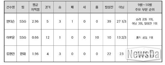SSG 앤더슨은 9~10월 5경기에 선발 등판해 3승을 거두며 승리 부문 공동 1위에 올랐다. 평균자책점 2.96을 기록했고, 삼진 39개를 잡아내며 탈삼진 부문 월간 1위를 차지했다. 앤더슨은 9~10월 경기 당 평균 8개에 가까운 탈삼진을 잡으며 245탈삼진으로 정규시즌을 마무리했다.