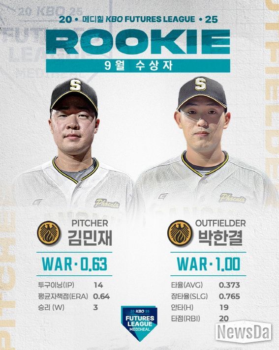 뉴스다 류대현 기자 | 2025 메디힐 KBO 퓨처스리그의 9월 퓨처스 루키상 수상자로 투수 부문에는 상무 김민재가 WAR 0.63, 타자 부문에는 상무 박한결이 WAR 1.00을 기록하며 각각 선정됐다.