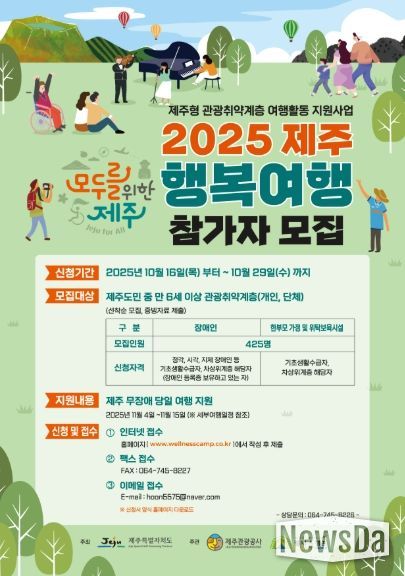 뉴스다 최광묵 기자 | 제주특별자치도와 제주관광공사는 오는 16일부터 29일까지 관광에서 소외되기 쉬운 취약계층에게 여행의 기회를 제공하기 위한 ‘제주 행복 여행’ 사업을 추진한다고 15일 밝혔다.