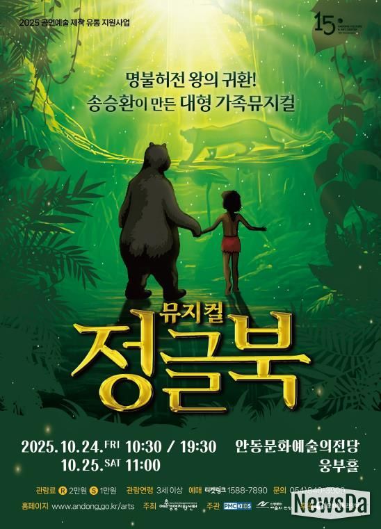 뉴스다 최광묵 기자 | 안동문화예술의전당은 예술경영지원센터가 주최하는 2025 공연예술 지역 유통사업의 일환으로 ‘가족뮤지컬 정글북’을 오는 10월 24일 10시 30분과 19시 30분, 25일 11시 3회 웅부홀에 올린다.