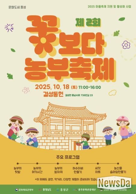 뉴스다 최광묵 기자 | (재)홍주문화관광재단 문화도시센터는 ‘마을축제 지원 및 활성화 사업’의 일환으로 오는 18일 오전 11시부터 오후 4시까지, 결성동헌(결성면 홍남서로 738번길 23)에서 ‘제2회 꽃보다 농부 축제’를 개최한다.