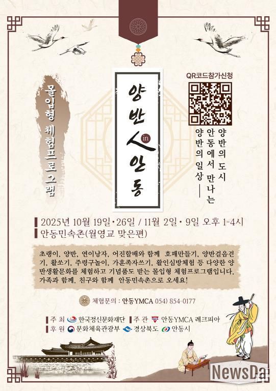 뉴스다 최광묵 기자 | 안동시와 한국정신문화재단은 오는 10월 19일부터 대한민국 문화도시 안동 조성사업의 일환으로 ‘양반人(in)안동’ 프로그램을 본격적으로 운영한다고 밝혔다.