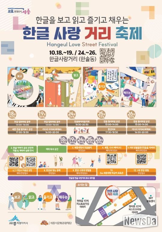 뉴스다 최광묵 기자 | 세종시문화관광재단은 오는 10월 18일부터 26일까지 한솔동 한글사랑거리(첫마을 정류장 인근) 일원에서 ‘한글 사랑거리 축제’를 개최한다. 이번 축제는 한글문화도시 세종의 상징공간인 ‘한글 사랑거리’를 중심으로 시민이 한글을 보고, 읽고, 즐기며 한글문화의 가치를 체험하는 문화축제로 마련됐다.