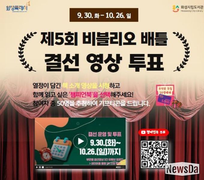 뉴스다 최광묵 기자 | 화성시문화관광재단은 오는 10월 26일까지 '제5회 비블리오 배틀' 결선 영상투표를 진행한다.