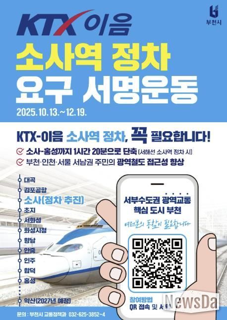 조용익 부천시장은 “KTX-이음 소사역 정차는 단순한 교통 개선을 넘어, 서해선 시대에 부천이 수도권 서남부의 중심으로 도약할 수 있는 계기”라며 “시민의 서명 하나하나가 소중한 힘이 되는 만큼 많은 참여를 바란다”고 말했다.