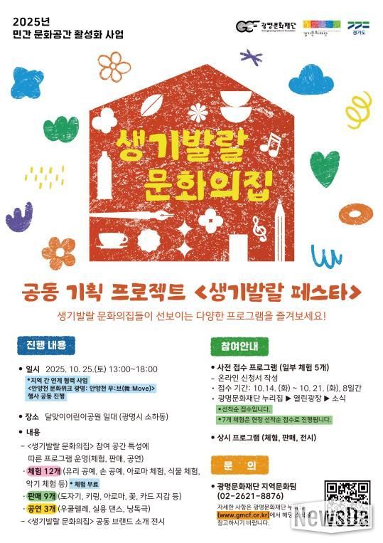 뉴스다 최광묵 기자 | (재)광명문화재단은 2025년 민간 문화공간 활성화 사업 '생기발랄 문화의집' 공동 기획 프로젝트 ‘생기발랄 페스타’를 10월 25일 오후 1시에 달맞이어린이공원에서 개최한다.